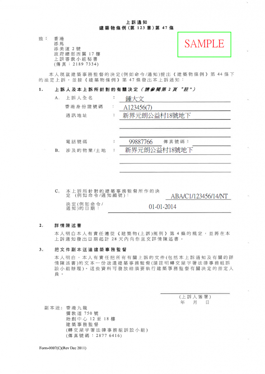 上訴通知表格《建築物條例》(第123章)第47條